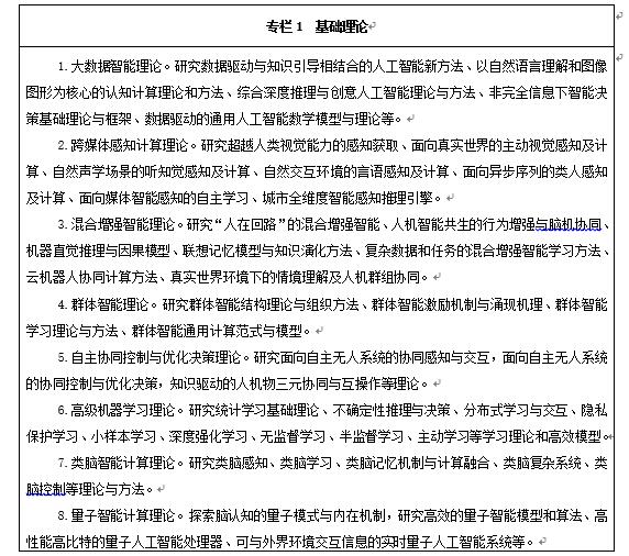 布局前沿基础理论研究。针对可能引发人工智能范式变革的方向,前瞻布局高级机器学习、类脑智能计算、量子智能计算等跨领域基础理论研究。高级机器学习理论重点突破自适应学习、自主学习等理论方法,实现具备高可解释性、强泛化能力的人工智能。类脑智能计算理论重点突破类脑的信息编码、处理、记忆、学习与推理理论,形成类脑复杂系统及类脑控制等理论与方法,建立大规模类脑智能计算的新模型和脑启发的认知计算模型。量子智能计算理论重点突破量子加速的机器学习方法,建立高性能计算与量子算法混合模型,形成高效精确自主的量子人工智能系统架构。